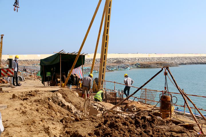 目前,東區(qū)油品碼頭工程,正在實(shí)施灌注樁施工,已經(jīng)完成23條。同時(shí)進(jìn)行的還有基槽挖泥施工和靜載試樁平臺(tái)搭設(shè)以及沉箱底座鋼筋綁扎、建設(shè)梁板預(yù)制場(chǎng),其中梁板預(yù)制場(chǎng)已經(jīng)完成80%的建設(shè)工程,即將具備預(yù)制開(kāi)工條件。