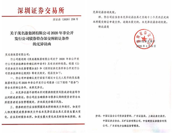 4月8日,茂名港集團(tuán)有限公司收到深圳證券交易所同意發(fā)行9億元非公開公司債的無異議函,這意味著集團(tuán)本輪9億元非公開公司債券申報(bào)工作圓滿成功。這是集團(tuán)繼2019年9月成功發(fā)行3億元非公開公司債后,再次通過發(fā)行公司債成功獲得融資。