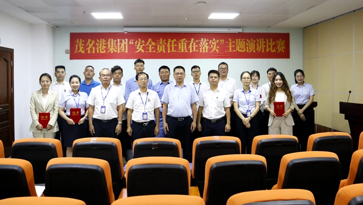 楊超燦對本次“安全責(zé)任重在落實”演講比賽給予充分肯定。他表示,本次比賽參與面廣,吸引了集團(tuán)辦公室、財務(wù)部、投資發(fā)展部、工程管理部以及各下屬企業(yè)的的選手參加,擴大了安全宣講的影響力,充分體現(xiàn)了“安全工作人人有責(zé)”;各位選手演講時神抖擻,內(nèi)容切合工作實際,言之有物,充分展現(xiàn)了茂名港人昂揚向上的良好精神風(fēng)貌。他強調(diào),今年是集團(tuán)重點項目建設(shè)的關(guān)鍵之年,我們要堅定信心,認(rèn)真學(xué)習(xí)本次演講主題“安全責(zé)任重在落實”的內(nèi)涵,把安全責(zé)任落實到每個環(huán)節(jié)、每個崗位、每個人,做到“守土有責(zé)、守土負(fù)責(zé)、守土盡責(zé)”,助力集團(tuán)生產(chǎn)運營、項目建設(shè)、疫情防控等各項工作取得成效,夯實本質(zhì)安全基礎(chǔ),推動集團(tuán)安全生產(chǎn)形勢持續(xù)穩(wěn)定向好。 評委們與參賽選手們合影 ↓↓