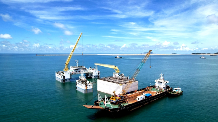 據(jù)了解,本工程12件沉箱均從博賀沉箱預(yù)制場(chǎng)出運(yùn),距茂名港博賀新港區(qū)東區(qū)油品碼頭E2泊位水路約10海里。沉箱在預(yù)制場(chǎng)上駁后,需在1.7m以上潮位,由功率4000HP的拖輪將半潛駁拖經(jīng)底標(biāo)高為-3.8m的出運(yùn)航道、漁港航道,繞過(guò)蓮頭嶺南側(cè)淺灘,至碼頭現(xiàn)場(chǎng)后,半潛駁利用GPS定位系統(tǒng)拋錨定位到碼頭前沿下潛坑下潛,沉箱浮游出駁,最后由方駁定位安裝。沉箱在安裝完成后,還會(huì)繼續(xù)往里面填料,再進(jìn)行沉箱的混凝土接高,封倉(cāng),胸墻施工等工序,全部完成后就可作為重型構(gòu)筑物的堅(jiān)實(shí)的基礎(chǔ)了。