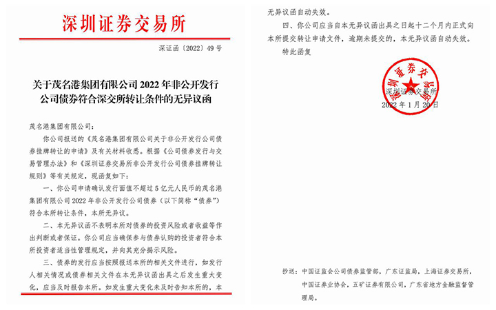1月21日,茂名港集團公司成功獲得深交所5億元公司債無異議函。獲得無異議函之后,標(biāo)志著我司已具備發(fā)行公司債的所有硬性條件。