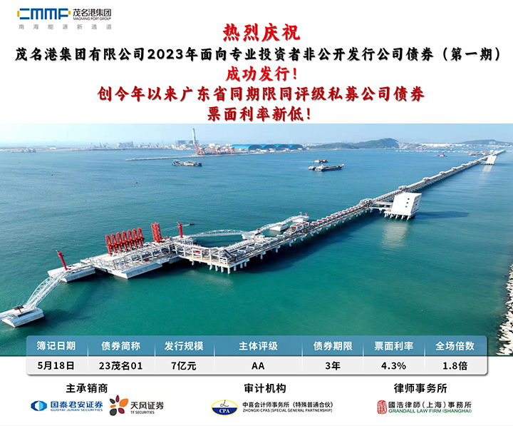 5月18日,茂名港集團(tuán)2023年非公開發(fā)行公司債券成功發(fā)行,募集規(guī)模7億元,期限為3年,票面利率4.3%,創(chuàng)下今年以來廣東省同期限同評級(jí)同品種票面利率新低,為集團(tuán)后續(xù)融資奠定了良好基礎(chǔ)。