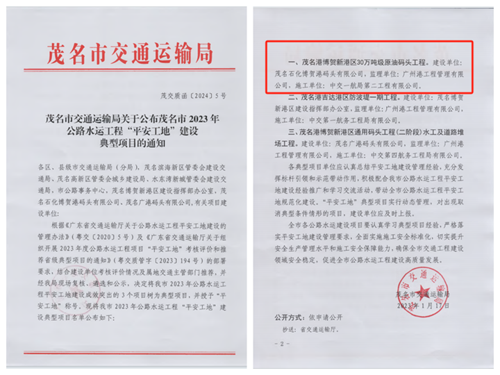 1月17日,茂名市交通運(yùn)輸局公布了茂名市2023年公路水運(yùn)工程“平安工地”建設(shè)典型項(xiàng)目的表彰名單,茂名港集團(tuán)下屬企業(yè)投資建設(shè)的茂名港博賀新港區(qū)30萬噸級(jí)原油碼頭工程被評(píng)為平安工地建設(shè)典型項(xiàng)目,榮獲“平安工地”稱號(hào)!