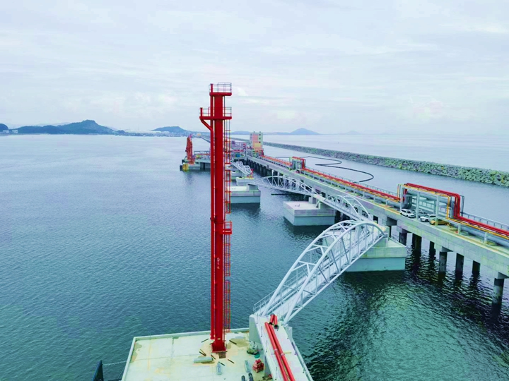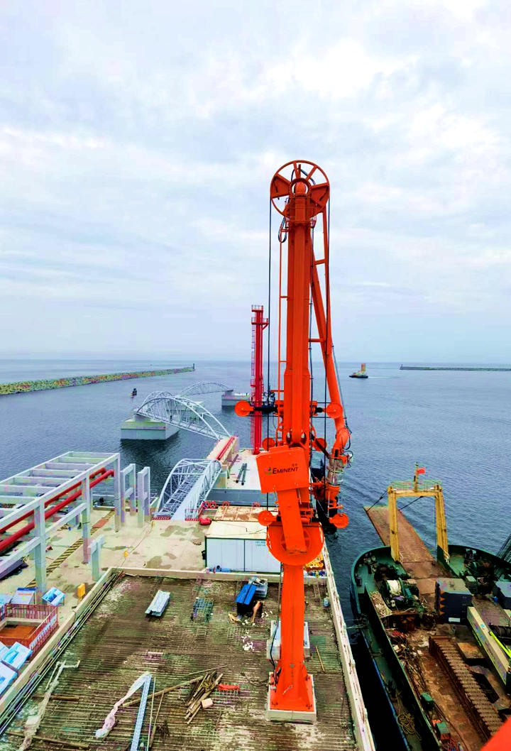 此次安裝的4臺(tái)裝卸臂堪稱碼頭“大動(dòng)脈”,每臺(tái)高23.3米、重41.83噸,采用電/液驅(qū)動(dòng)技術(shù),具備高效、安全、穩(wěn)定的輸油能力,全部投用后,每年可助力完成1650萬噸原油輸送任務(wù),將大幅提升茂名港原油接卸與中轉(zhuǎn)效率。同步安裝的具有浮動(dòng)功能的登船梯高26.5米、重約32噸,根據(jù)潮汐自動(dòng)調(diào)節(jié)梯高度的智能設(shè)計(jì),為10萬到30萬噸級(jí)的船舶提供了安全便捷的通道;2座高29米的消防炮塔上的消防水炮最大覆蓋半徑達(dá)99米,其射程遠(yuǎn)、流量大,如同“安全衛(wèi)士”構(gòu)筑起碼頭前沿的安全保障網(wǎng)。