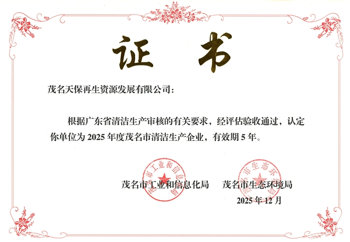 近日,茂名天保再生資源發(fā)展有限公司(以下簡(jiǎn)稱“天保公司”)正式確定為茂名市2025年度清潔生產(chǎn)企業(yè),該認(rèn)定有效期為5年。